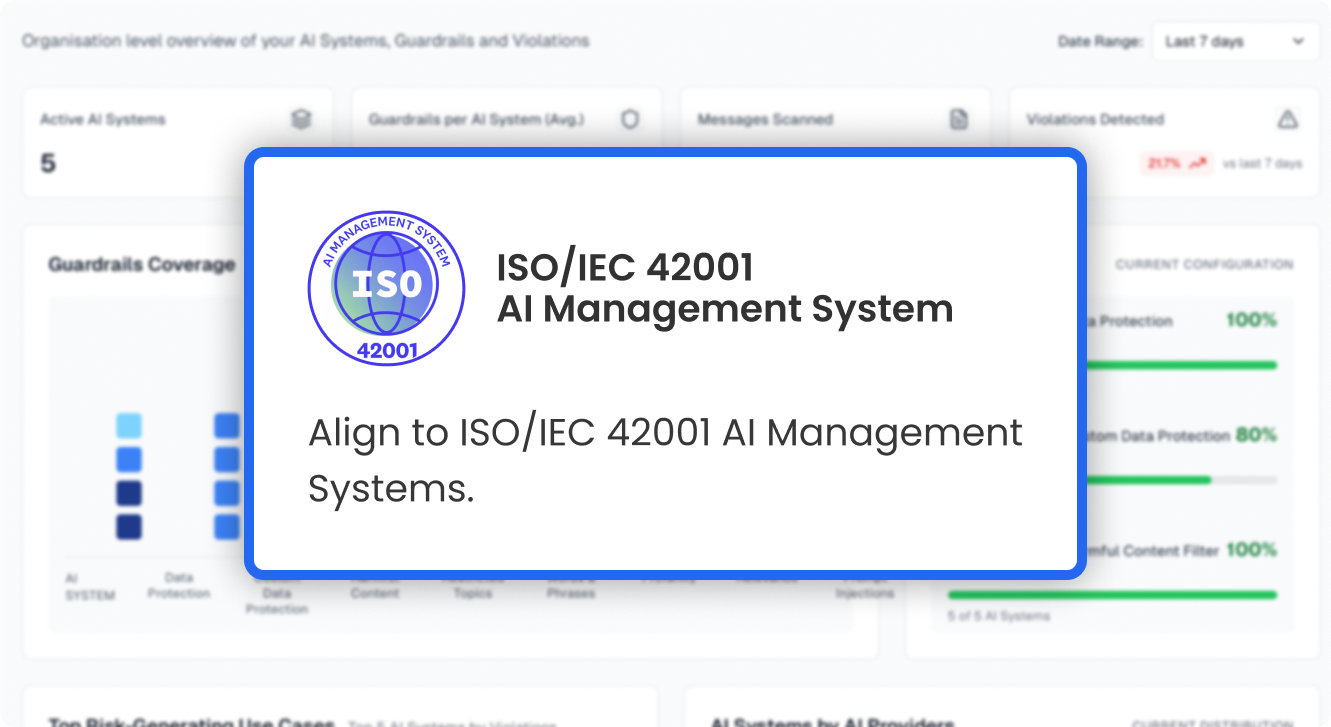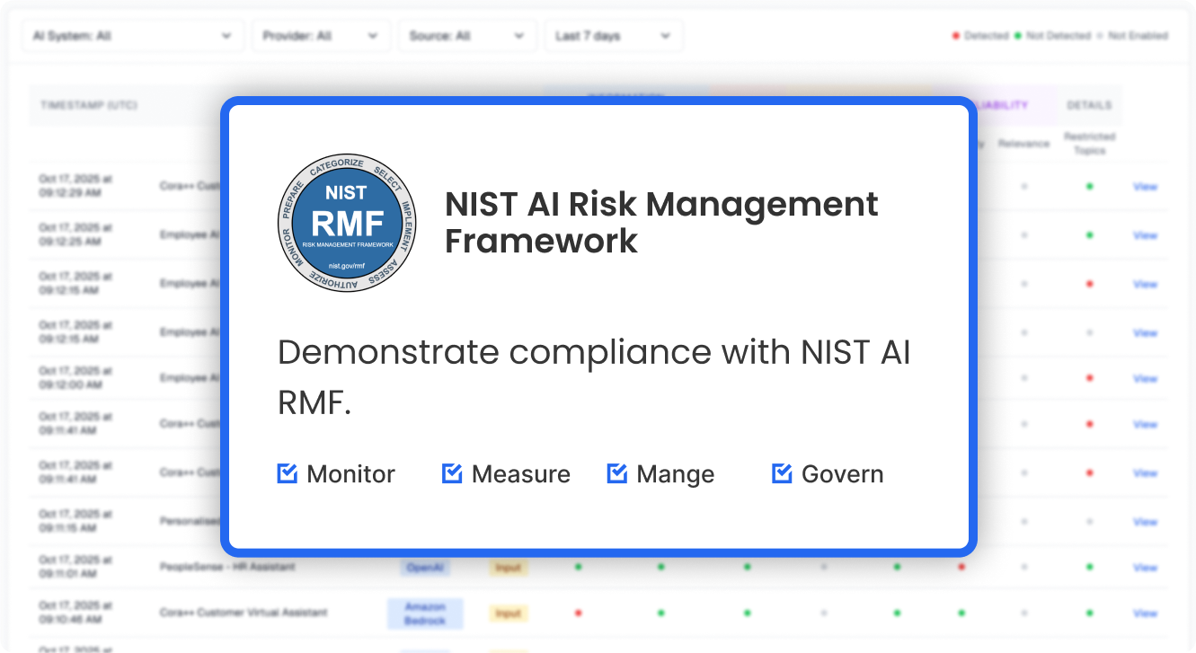 Generate audit-ready reports, mapped directly to EU AI Act, ISO/IEC 42001, and NIST AI RMF.